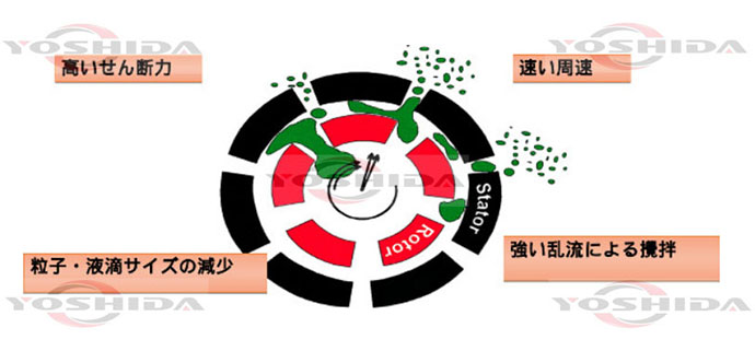 乳化とは、水と油のような、本来は混ざらない物質同士を混じり合わせることです。エマルションと呼ばれることもあります。 | 所谓乳化就像水和油一样本来两者不互溶的物料进行充分的互溶。 |