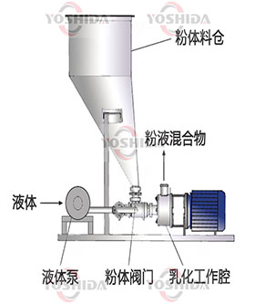 粉液混合 在标准式的卧式高剪切乳化机的进料口增加一粉料进入口。