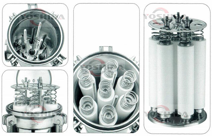 滤芯式过滤器根据实际流量不同内部有不同的n支滤芯,物料通过进口管道流入,从滤芯的外侧流向内侧,最后从出口流出,固体杂质在通过时被滤芯收集。